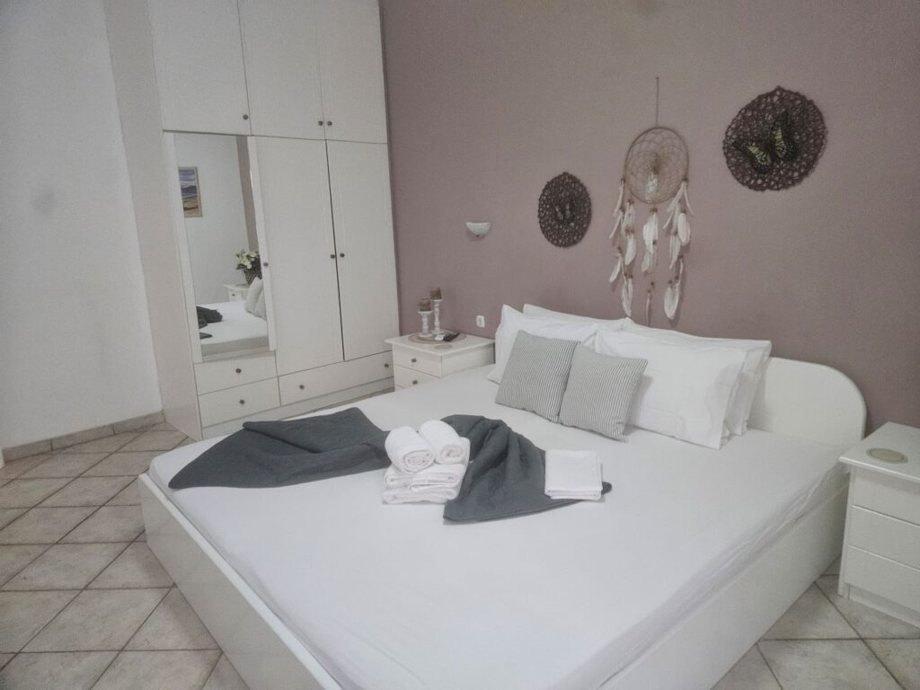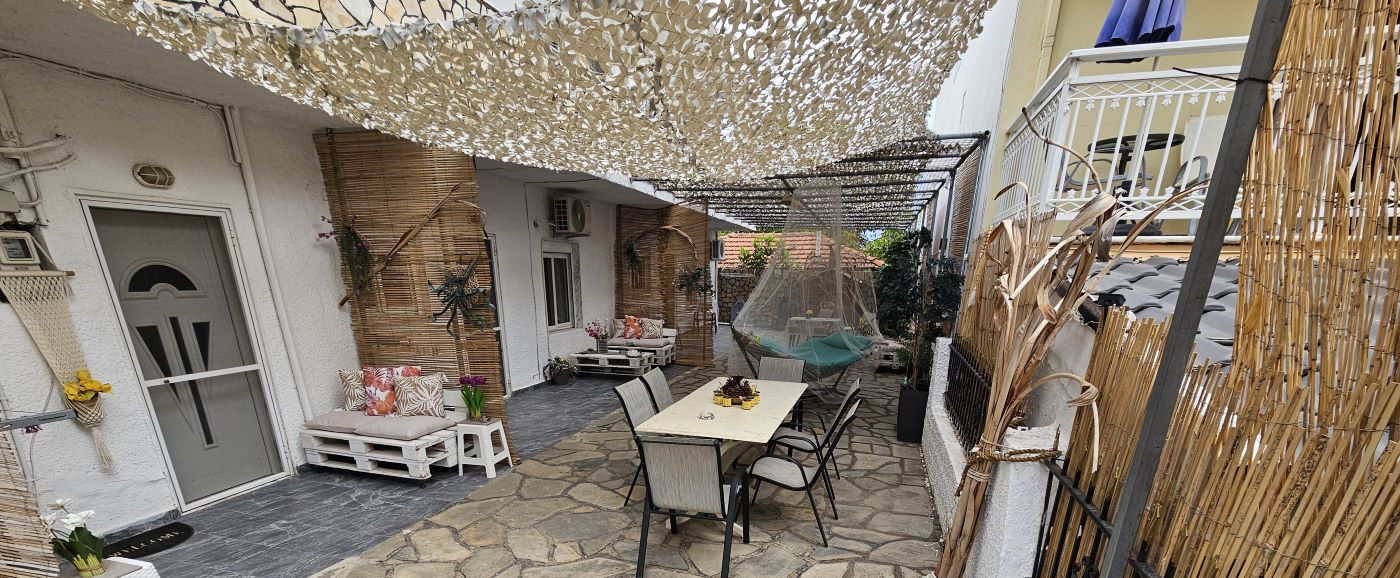 Апартманот се наоѓа на приземје и располага со две простории.Во првата просторија е кујната која е основно опремена со кујнски инвентар за лесни оброци без пржење,голем фрижидер,ел.шпорет со фурна, аспиратор,чајник и има кревет на спуштање наменет за спиење на 1 возрасен+1 дете.Втората просторија е спланата соба во која има еден дупли кревет комотен за спиење на две лица, тв, плакар за алишта и клима уред.Од апартманот се излегува на сопствен двор декоративно среден со маса и столици и полн со зеленило.Апартманот располага со стандардно купатило и WC.